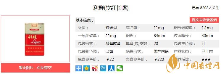 在配方上,選擇國內(nèi)外香氣足、煙堿適中、焦油含量低的優(yōu)質(zhì)煙葉,精心配比,在化學(xué)成分比例協(xié)調(diào)的基礎(chǔ)上,配合特殊的優(yōu)質(zhì)進(jìn)口香精香料,保證其突出的香氣風(fēng)格和特征。經(jīng)香煙網(wǎng)小編市場(chǎng)調(diào)查利群軟紅長嘴售價(jià)為22元/包。