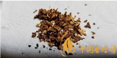 攤開煙絲,明黃的烤煙和暗棕的晾煙比例基本接近1:1。有切得很細(xì)碎的煙梗交雜其間??緹煴壤饶β甯绨姹疽愿咭恍?/p>
