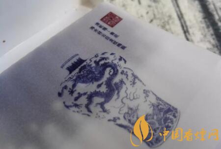 先來欣賞一下煙盒內(nèi)里的包裝設(shè)計特點。向上掀開合蓋,會發(fā)現(xiàn)上蓋內(nèi)里印有數(shù)條騰龍圖案,以及china瓷字樣。