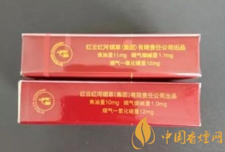 翻轉(zhuǎn)至煙盒的左側(cè),都是生產(chǎn)廠商的名稱和這款香煙的理化含量標識。廠家同為“紅云紅河煙草(集團)有限責(zé)任公司”。