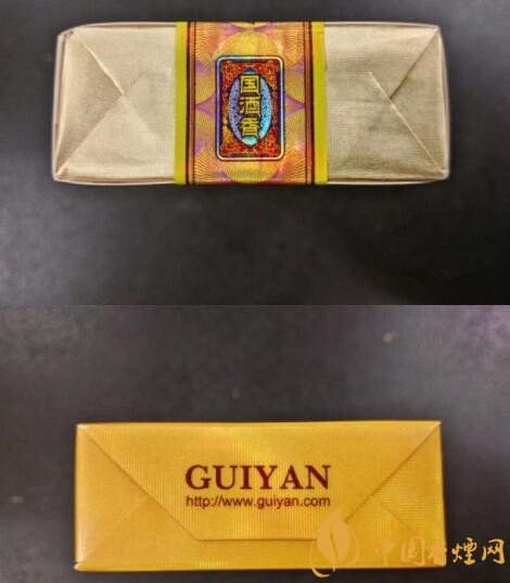 頂部可見內(nèi)襯紙為淺金色,彩色的國(guó)酒香封簽條亦是顯得比較活潑。底部則印著貴煙的拼音與網(wǎng)址。
