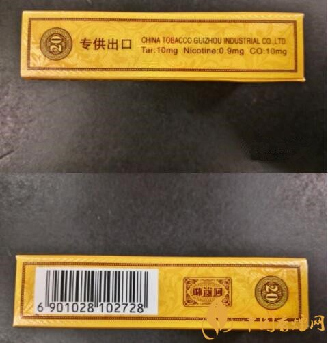 煙盒的兩側(cè)都有用到葉狀的底紋裝飾,左側(cè)用中文標(biāo)注了專供出口的身份,而貴煙公司名稱和理化指標(biāo)都用英文替代,焦油10mg/尼古丁0.9mg/一氧化碳10mg,數(shù)值不高不低。右側(cè)則印著中文的國(guó)酒香品名和商品條碼,掃碼并未顯示出口何地。