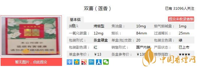 雙喜蓮香煙煙支長(zhǎng)84mm,過濾嘴長(zhǎng)34mm,煙支呈767排列,煙支設(shè)計(jì)簡(jiǎn)單清新,淺黃色的煙嘴配上雙喜logo,一朵蓮花襯托在雙喜的logo旁。煙絲色澤深黃,無煙梗,煙葉發(fā)酵程度、膨脹程度合適。下面我們一起來看雙喜蓮香的參數(shù)信息:焦油量:10mg 煙堿量:1.0mg 一氧化碳量:12mg