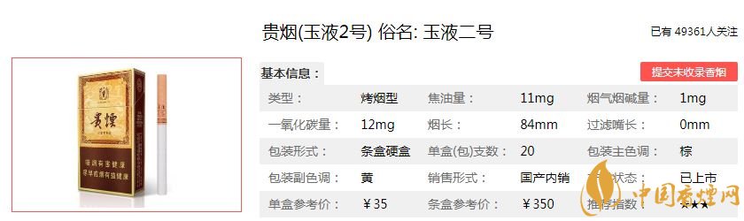 貴煙創(chuàng)牌于1978年,距今已有四十多年的歷史了,貴煙在煙草市場一直是享譽(yù)盛名。今天香煙網(wǎng)為大家介紹一款貴煙玉液2號香煙。下面是貴煙玉液2號的價格參數(shù)以及抽過的煙民對這款煙的評價,一起來看看吧。