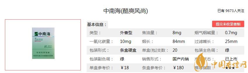中南海香煙是國內(nèi)首個低焦含量的香煙品牌,旗下的香煙品種很多,不僅用于內(nèi)銷,很多香煙還對外出口,是國內(nèi)目前最為暢銷的香煙品牌之一。中南??崴L(fēng)尚屬于典型的外香型香煙,外觀清新淡雅,突出與口感結(jié)合的清涼之意。