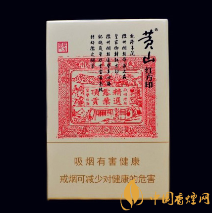 小紅方印香煙采用“露葉”,即煙株自上向下第二層避免紫外線直射且被露水滋潤的煙葉為主要原料,濕潤甘怡,而且是低焦設(shè)計,口感很不錯。4.黃山(小紅方印)—小方