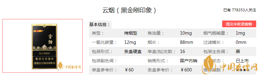 黑金剛印象為烤煙型香煙,焦油量為10mg,煙堿量為1.0mg,一氧化碳量為12mg。小盒零售價是60元/盒,條盒零售價為600 元/條。具體參數(shù)如下: