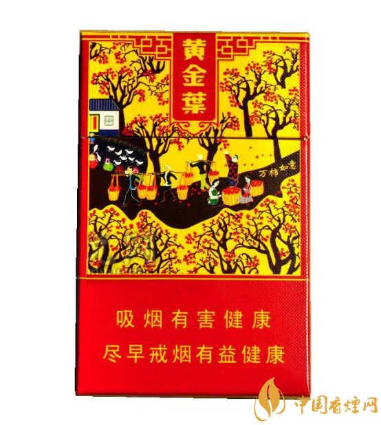 黃金葉(萬柿如意)又名黃金葉(金如意),它是一款充滿了鄉(xiāng)土氣息的產(chǎn)品。品名萬柿如意,諧音萬事如意,傳遞出了一種美好的祝福,比較適合一些喜慶的時(shí)刻,那到底是不是一款好煙呢,當(dāng)然要抽才知道! 正面包裝一眼看過去很是花哨,仔細(xì)一看,首先給人一種喜慶的感覺,三分之二的正面被一副萬柿圖覆蓋,圖案的底色為黃色,上面有成熟的紅色的柿子,還有農(nóng)民挑著收割好的柿子回家的繁榮景象,鄉(xiāng)土氣息,繁榮氣息,喜慶氣息很是濃郁,盒子上部的中央豎款的黃金葉三字真可謂是畫龍點(diǎn)睛。