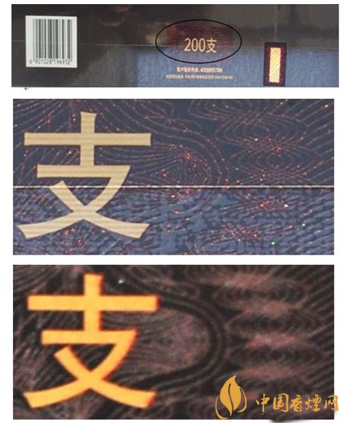 真煙采用超細(xì)線防偽,線條交叉處條紋清晰,不粘連;假煙超細(xì)線處印刷粗糙,交叉處粘連、模糊。