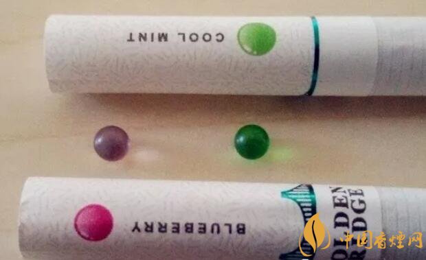 國產(chǎn)爆珠香煙金橋煙支上一道綠箍,一座綠色的金門大橋坐落其上,暗示了這包煙即使不爆珠也自帶的涼味。水松紙上有爆珠示意圖,靠唇端是紫紅色的藍(lán)莓,靠煙絲端是翠綠色的薄荷。又要用圓點(diǎn)顯示爆珠位置,又要用英文字母標(biāo)注爆珠口味,如果同處一側(cè)將顯得擁擠,因此二者分居濾嘴兩側(cè)錯開。煙支上沒有漢字,GOLDEN BRIDGE、BLUEBERRY和COOL MINT,營造出了外煙的既視感。