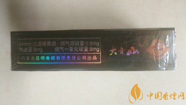 煙盒右側(cè)標注著香煙的理化數(shù)值,標注著過濾嘴香煙長84mm,0.8mg煙氣煙堿量,8mg焦油量,8mg煙氣一氧化碳量,印有主品牌單位和“云煙”的字樣。