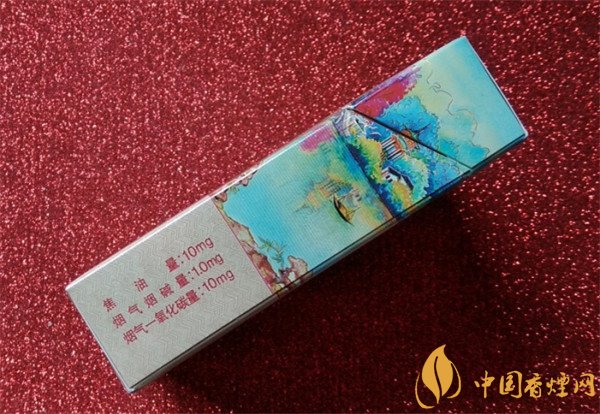 盒右側(cè)標(biāo)注著明確的理化值,1.0mg煙氣煙堿量,10mg焦油量,10mg煙氣一氧化碳量,上端印有夢幻般的江南風(fēng)景圖案,風(fēng)格獨特,特別的討喜,以年輕人的審美觀來看,非常有檔次和個性,有一種獨特的韻味。