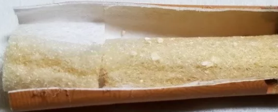 剖開(kāi)濾嘴...是兩段式濾嘴,前段占據(jù)2/3,絲束里夾雜細(xì)碎的白色顆粒,想來(lái)是細(xì)微甜。濾嘴有降焦孔,基本開(kāi)在了整個(gè)濾嘴的中段位置。從兩段絲束的顏色變化來(lái)看,基本均勻,略微變成了淡黃色??磥?lái)煙支的延燒性、空氣的介入等調(diào)節(jié)得都比較理想。香之物。
