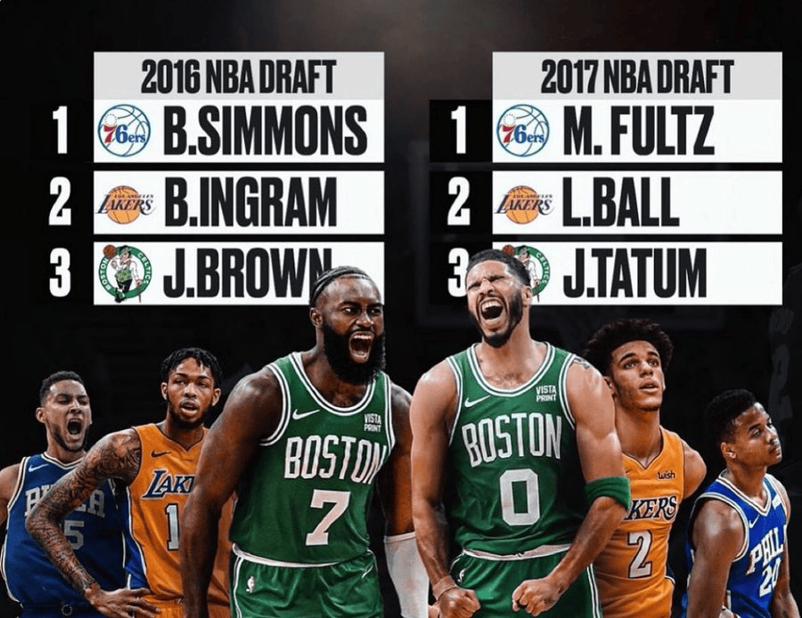 16年選秀大會(huì),76人狀元簽選中本-西蒙斯,凱爾特人探花簽選中杰倫-布朗;17年選秀大會(huì),76人狀元簽選中富爾茨,凱爾特人探花簽選中塔圖姆。