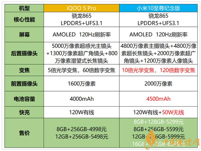 小米10至尊紀念版的8GB+256GB售價5599元,12GB+256GB售價5999元,iQOO5 Pro分別為4998元和5498元,兩個版本的差價分別是500元、600元。