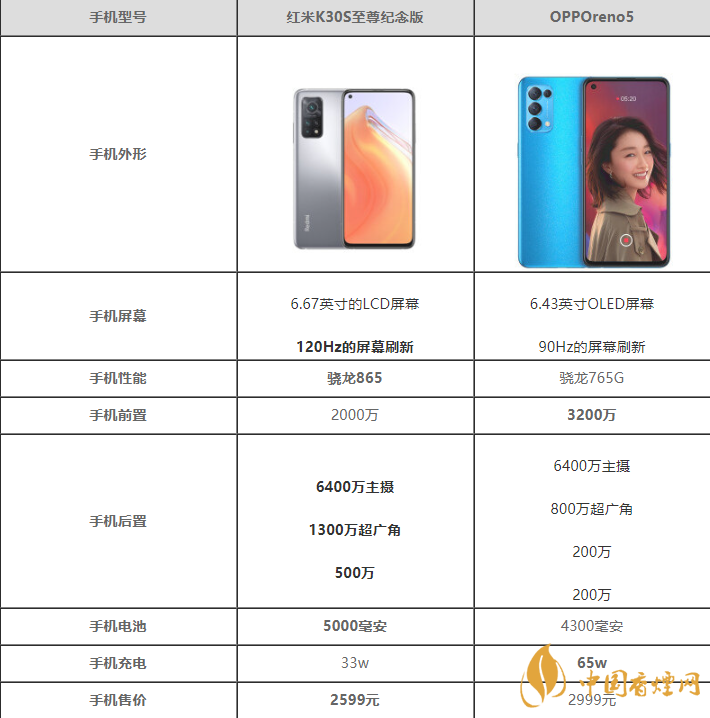 紅米K30S至尊紀念版電池5000毫安,提供33w的閃充。OPPOreno5電池4300毫安,支持65w的充電速度