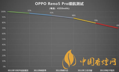 根據(jù)測試結(jié)果顯示,使用OPPO Reno5 Pro觀看60分鐘1080P視頻僅耗電3%、刷30分鐘微博僅耗電4%、刷30分鐘抖音僅耗電5%、玩30分鐘《王者榮耀》僅耗電9%、玩30分鐘《和平精英》僅耗電9%,在高強(qiáng)度使用3小時后,OPPO Reno5 Pro共計(jì)耗電30%,剩余電量還有70%。