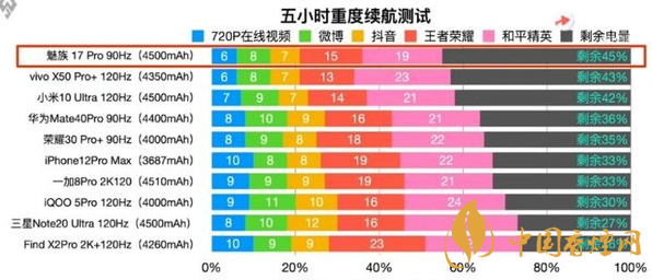 這次測評主要通過對720P在線視頻、刷微博,抖音,打王者榮耀和平精英等日常應(yīng)用進(jìn)行測試,得出了5G旗艦的五小時重度續(xù)航排名。其中,續(xù)航最好的機(jī)型是魅族17 Pro,經(jīng)過五小時的重度測試,該機(jī)還剩下45%的電量。