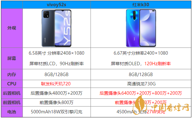 小結:在屏幕方面,OLED材質在亮度、對比度,可視角度等方面優(yōu)于LCD材質屏幕,所以,不論是從屏幕材質還是所支持的屏幕刷新率來說,紅米k30優(yōu)于vivoy52S