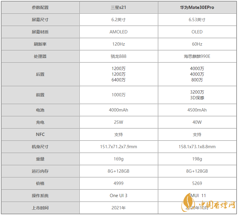 三星s21手機已經(jīng)正式發(fā)布啦,相信有不少小伙伴們都非常關注三星s21手機,那么三星s21和華為Mate30EPro有什么區(qū)別?哪款手機更好?下面香煙網(wǎng)小編為大家介紹一下關于三星s21和華為Mate30EPro的詳細對比,一起來看看吧!