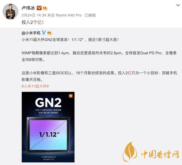 前幾天小米11超大杯預(yù)熱的海報里,直接叫板挑戰(zhàn)專業(yè)影像!據(jù)官方解釋,這顆鏡頭是小米影像和三星用時18個月聯(lián)合研發(fā)的成果,盧偉冰也直接發(fā)博坦言道,小米為這個元器件投入了兩個億!小米去年首發(fā)一億像素,今年首發(fā)GN2,都投入了大量資金,從這上面就能看到,小米這兩年為了突破相機的天花板而做出的努力!