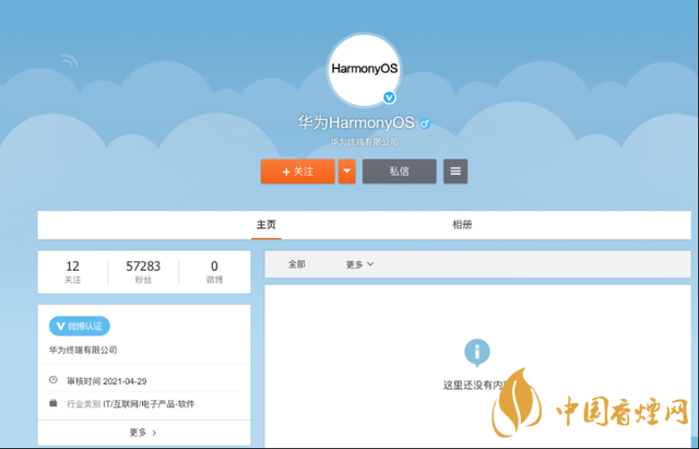微博頁面顯示,“華為HarmonyOS”微博認(rèn)證為華為終端有限公司,審核時間為4月29日。雖然目前該官方微博還未發(fā)布任何動態(tài),但粉絲量已經(jīng)接近6萬。