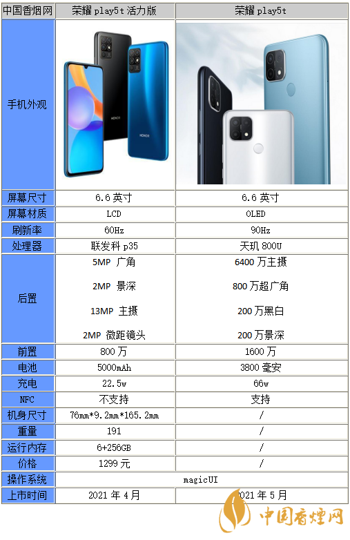 以上就是小編收集到的榮耀play5和榮耀play5t活力版區(qū)別在哪-參數(shù)性能分析的相關(guān)內(nèi)容,以上內(nèi)容均來源于網(wǎng)絡(luò),僅供參考,一切以實際為準(zhǔn),更多最新數(shù)碼資訊請關(guān)注香煙網(wǎng)。