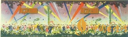 最為獨特的團結(jié)主題煙標莫過于貴陽煙草公司出品的“祖國”煙標。這枚出品于上世紀50年代的煙標,以橫長的寬幅全景畫面,描繪了在彩色射燈的襯托下,我國各族人民歡聚于華表周圍盡情舞蹈的宏大場面。