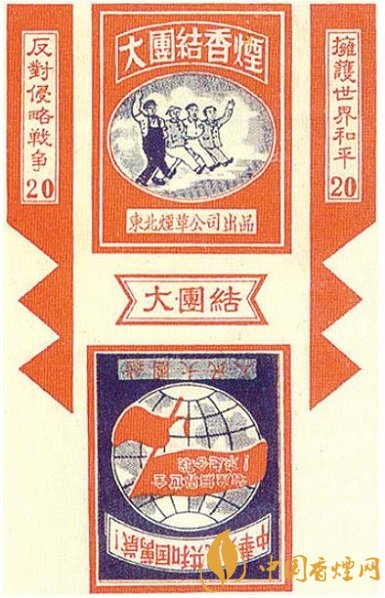 東北煙草公司出品的“大團結(jié)”煙標,主版圖案為4個男性人物攜手并進的場景,側(cè)標位置分別印有“擁護世界和平”“反對侵略戰(zhàn)爭”字樣,副版圖案為地球上飄揚著一面上書“全世界無產(chǎn)者聯(lián)合起來”字樣的旗幟,在其上下則分別印有“中華人民共和國萬歲”“人民大團結(jié)”字樣。