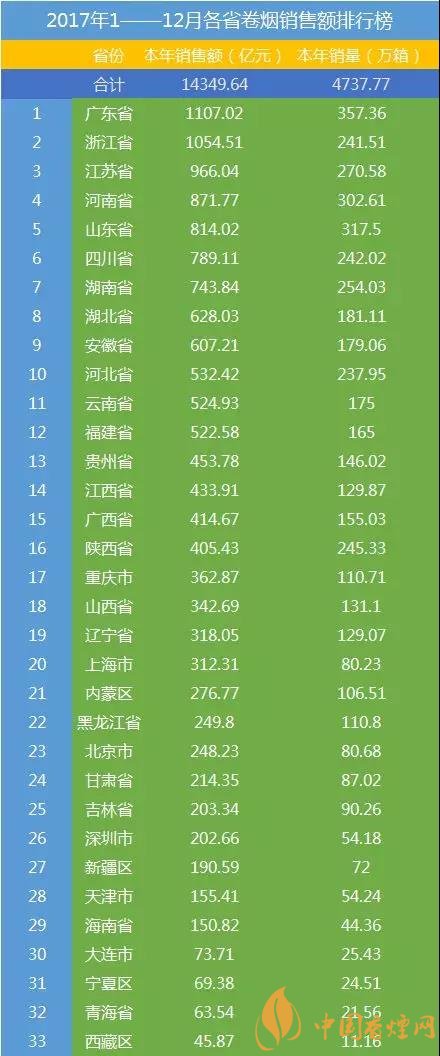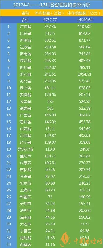 轉(zhuǎn)眼2018已經(jīng)到來,上次小編寫到2017年商業(yè)品牌銷量的前15名,今天就來和大家說說各地卷煙銷量情況。在剛剛過去的2017這一年里,你為家鄉(xiāng)卷煙銷量都貢獻了多少呢?最新中國香煙銷量排行榜前10名出爐!下面香煙網(wǎng)小編為大家整理介紹。
