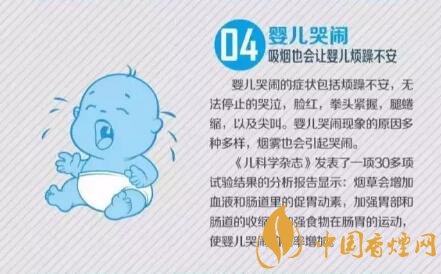 《兒科學(xué)雜志》發(fā)表了一項(xiàng)30多項(xiàng)試驗(yàn)結(jié)果的分析報(bào)告顯示:煙草會增加血液和腸道里的促胃動素,加強(qiáng)胃8部和腸道的收縮,加強(qiáng)食物在腸胃的運(yùn)動,使嬰兒哭鬧的概率增加。