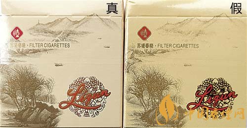 真品商標(biāo)紙采用膠印印刷,中間“利群”文字及拼音采用壓凸?fàn)C金工藝,用手摸凹凸感明顯,“蘇堤春曉”主體圖案顏色較深;假煙采用高清掃描仿制印刷,中間“利群”文字及拼音用手摸無凹凸感,“蘇堤春曉”主體圖案顏色較淡,商標(biāo)紙整體顏色偏黃。