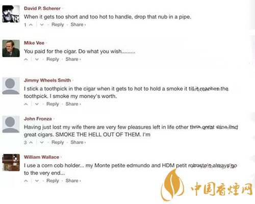 5、 William Wallace:我用玉米棒來裝抽到很短的雪茄,這個(gè)方法可以讓我的蒙特小艾蒙多和HDM小羅布圖抽到非常非常短的程度……