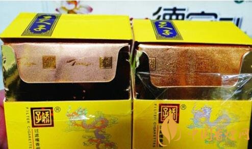 真品小盒正面套印定位燙金“飛龍”圖案鱗片清晰,從頭至尾都能看到定位燙金工藝,紅色貫穿整個龍身,“鱗片”是雪里透紅,栩栩如生;假煙套印定位燙金仿制較差,鱗片無法達(dá)到真品的印刷工藝水平,印刷工藝與真品商標(biāo)圖案差異明顯。
