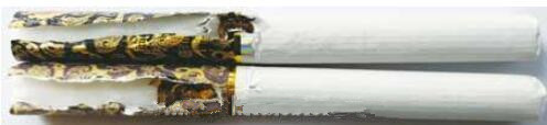 真煙煙支采用單一醋纖濾嘴,過濾嘴長(zhǎng)度為30mm;假煙煙支過濾嘴較短長(zhǎng)度約為22mm,與真品特征存在明顯差異。