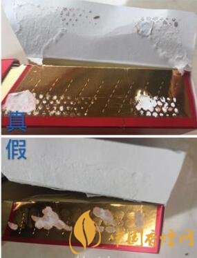 真品卷煙側(cè)邊有一條與側(cè)邊平行的機器壓痕;假煙采用手工燙封,沒有機器留下的壓痕。