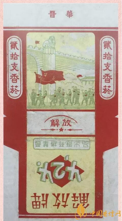 “424”解放牌卷煙 1949年4月24日,中國人民解放軍攻克了太原。太原戰(zhàn)役規(guī)模龐大,戰(zhàn)況慘烈,是中國人民解放軍經(jīng)典的戰(zhàn)役之一。山西晉華卷煙廠為紀(jì)念此日,出品“424”解放牌卷煙。煙標(biāo)上面是在太原首義門前,中國人民解放軍軍隊(duì)敲鑼吹號(hào)、勝利凱旋的畫面。