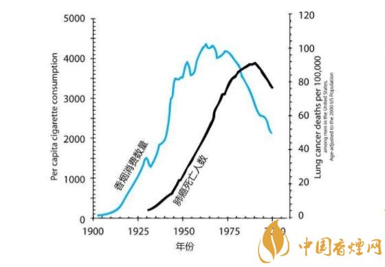 大家一看這個圖,就會發(fā)現(xiàn)吸煙數(shù)量和肺癌死亡數(shù)量的曲線幾乎一模一樣,但有大約25年的滯后:吸煙增加,肺癌會在25年后相應(yīng)增加,吸煙減少,肺癌也會在25年后相應(yīng)減少。這個奇特的滯后主要是因?yàn)榉伟┌l(fā)生是個非常慢的過程,從癌前變異,到早期癌癥,到晚期癌癥,一般需要10~20年時間。