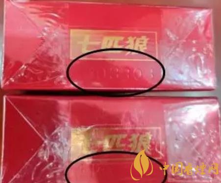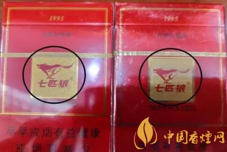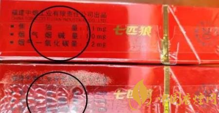 1、商標(biāo)紙上的“七匹狼”商標(biāo)圖案:真煙套印準(zhǔn)確,燙金飽滿,色澤鮮亮,圖案生動,立體感強。假煙燙金套印容易出現(xiàn)錯位,燙金處會出現(xiàn)漏金現(xiàn)象,顏色相較真煙暗沉,立體感差。(左真右假)