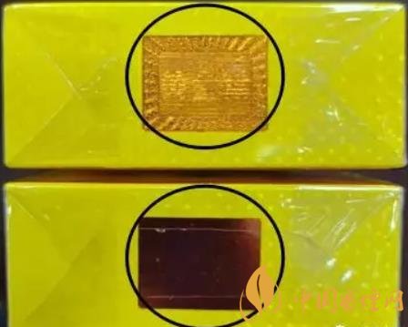 3、煙盒頂部防偽標(biāo)識:真煙在不同角度可見黃金葉文字與圖案相互變換。假煙未能顯現(xiàn)真煙防偽標(biāo)識的效果,或者文字與圖案層疊無法清晰分離。(上真下假)