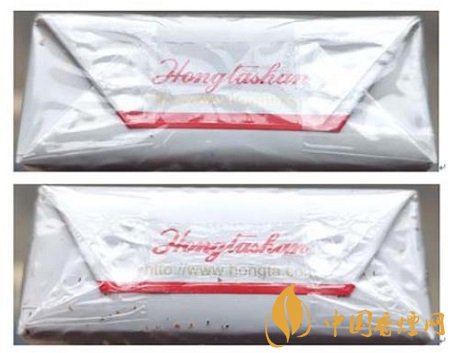 假冒卷煙:1.透明紙燙封收縮雜亂、死板,水汽較重。2.商標紙拐角折疊緊實,無空隙。(上真下假)