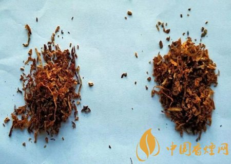 真煙:煙絲成絲率高,無膨脹葉絲和膨脹梗絲,有造紙法再造煙葉。(左真右假)