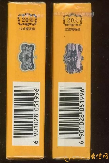 假煙: 1.拉線頭形狀偏尖。2.拉線上的“云煙印象煙莊”字體無紫外熒光效果,顏色較淡,無明顯的泛白效果。3.“雙龍戲珠”鐳射印刷模糊,無立體感,整體比真煙偏大。