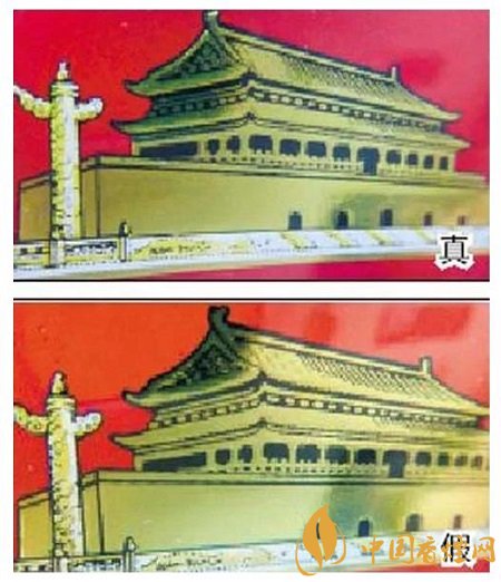 真煙天安門(mén)左側(cè)華表套色均勻,黃白色分布有明顯分界點(diǎn),邊緣光滑、干凈、清晰;假煙套色較差,黃白色不明顯,黃色部分印刷較分散,字體邊緣套印有毛渣點(diǎn),呈現(xiàn)鋸齒狀。