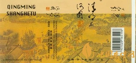 上世紀(jì)80年代,開封卷煙廠出品的“宋城”煙標(biāo),則采用廣闊的全景畫表現(xiàn)形式,選取了該畫作的后半部分:只見高大的城樓兩側(cè)的屋宇鱗次櫛比,街市行人摩肩接踵;士農(nóng)工商、男女老幼、三教九流,無所不備。