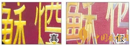 真煙:燙金字體線條清晰、不漏金,金色部分成色純正。假煙:燙金字體線條不清晰,有漏金現象,金色部分成色暗淡。