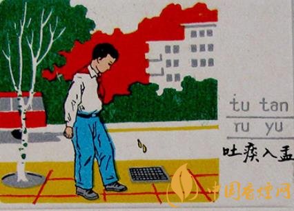 火花圖案采用宣傳畫的形式,人物形象生動(dòng)逼真,色彩鮮艷明快,具有濃郁的生活氣息。如一枚主題為“吐痰入盂”的火花(圖2)上,一位穿白襯衫系紅領(lǐng)巾的小男孩正彎著腰,對(duì)準(zhǔn)人行道的一口窨井吐入一口痰。背標(biāo)除一枚“精神文明”紅色橢圓篆印外,另有“小小一口痰,細(xì)菌千千萬”的宣傳文字;還有一枚主題為“講衛(wèi)生”的火花上,一個(gè)揮舞著小紅旗的大爺,在綠樹成陰、高樓林立的繁華鬧市,正對(duì)一年輕家庭亂扔垃圾的行為進(jìn)行勸說教育,旁邊佩戴紅袖章的大媽打掃著他們隨手丟棄的雜物,小女孩則在一旁低頭認(rèn)錯(cuò)。副標(biāo)上“違章必罰”的紅色篆印十分醒目。通過小小的火柴,科學(xué)宣傳防疫知識(shí),提高公眾自我保護(hù)意識(shí),早宣傳,早預(yù)防,起到了事半功倍的作用。