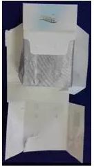 小盒透明紙材質(zhì)、包裝方式同條盒,拉帶頭為半橢圓形,位于正面左側(cè),順時針拉開。商標(biāo)紙為白卡紙,膠粘劑類型為白乳膠,兩側(cè)點(diǎn)陣膠。