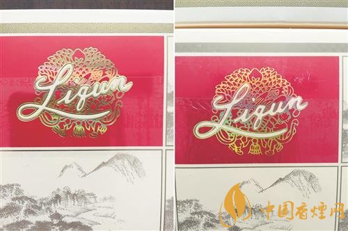 商標(biāo)紙印刷工藝差異對(duì)比:真煙“Liqun”字母以及花球的圖案清晰,線條清晰飽滿,立體感較強(qiáng)。假煙圖案整體較為模糊,字體不飽滿,邊緣不清晰,無立體感。