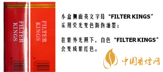 2.小盒:光變防偽涂層——小包側(cè)面“FILTER KINGS”字樣,經(jīng)陽光直射或紫外光照射后由白色變成紫紅色,停止照射后,紫紅色會逐漸消退。